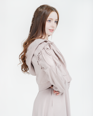 Woman wearing a hoodie with bows and a dusty rose long dress on a white background