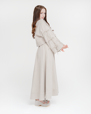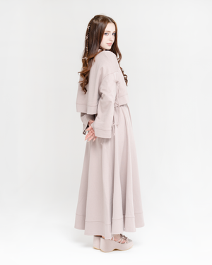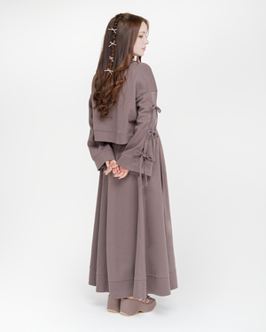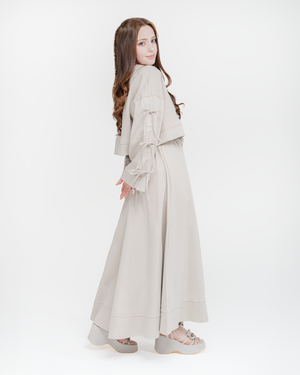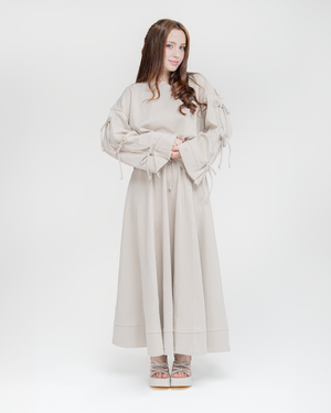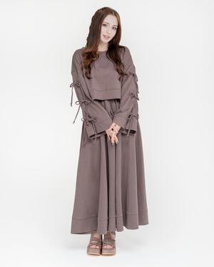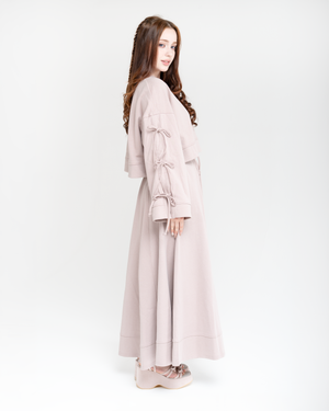 Dramatic wide sleeves adorned with adjustable soft-tied bows.